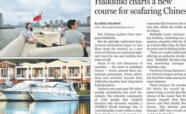 Along with the Italians, Halkidiki became interested in another parts of the world – in Asia. China Daily in collaboration with Consulate of Greece in Shanghai and Thessaloniki Municipality prepared material about yachting in the region. The publication presented Chalkidiki and Thessaloniki as an attractive option for cultural, gastronomic and sea travel.